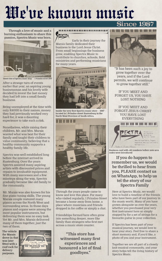 Spectra Music began in 1987 when a young couple in Rustenburg took a leap of faith and invested everything they had into a small music store. What started as a risk grew into a place where musicians, students, and friends gathered for decades.